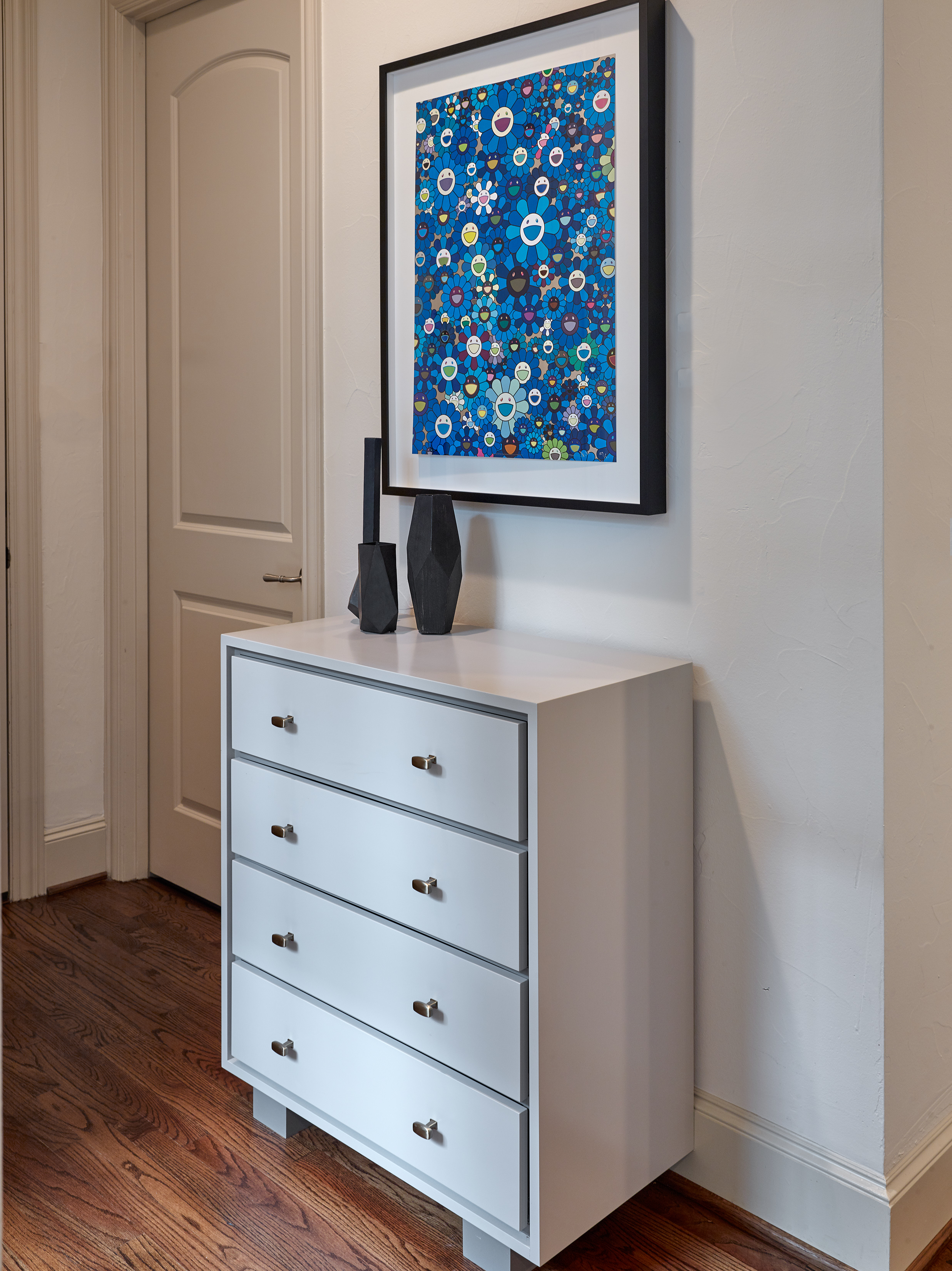 This three-story duplex in University Park was built on a narrow lot, which creates several areas in the home that are slightly awkward and tight on space. The once-forgotten den off the main foyer has now become the family’s “favorite hang out spot” for television watching, reading, and just lounging about. The home’s exterior and interior architecture leans towards a more traditional style but our clients appreciate a more modern and clean aesthetic. We designed and selected pieces that would bridge the gap and create harmony among the typically contrasting styles. The art and photography looks comfortably at home, positioned among the relaxed furnishings, finishes, and family members.